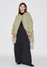 Lightly padded quilted coat perfect for transitional weather. Features round collar, hidden zipper placket, and straight hem. Two pockets.